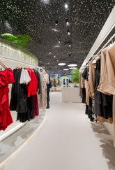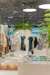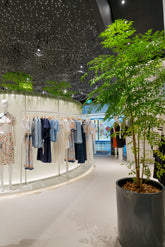 Embracing a refreshing white color scheme adorned with abundant greenery, the boutique immerses shoppers in a tranquil and eco-friendly ambiance. This intentional design choice transforms the shopping experience into a serene exploration, mirroring the brand's ethos of natural beauty. The central showcase beneath a ceiling that replicates a starlit night sky is a captivating focal point, where sophistication meets the enchantment of nature.