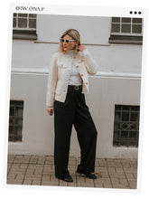 For styling, the jacket pairs exceptionally well with high-waisted skirts, as shown in the image, creating a silhouette that is both professional and feminine. It also works seamlessly with straight-leg trousers or even over a slender sheath dress for business occasions.