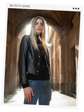This jacket's streamlined silhouette is accentuated with a button front closure, featuring golden buttons that stand out against the jet-black material for a hint of luxury. The pockets are subtly integrated, maintaining the jacket's sleek look while offering practicality.