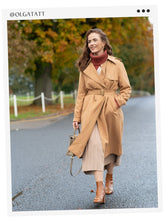 For styling, this trench coat effortlessly layers over autumnal knits, as shown, with its length pairing perfectly with midi skirts for a fluid, elongated look. The addition of leather boots echoes the coat's texture and grounds the outfit with a touch of modernity.