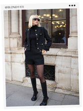 The Elegant Black Tweed Cropped Women Jacket is speckled with subtle flecks of color, providing depth and interest to the fabric. This contemporary piece is elevated by the ornate golden buttons, which add a touch of luxury and contrast beautifully against the textured background.