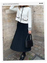 The Tweed Jacket And Pleated Dress Two-Piece Suit, a fabric long associated with classic style, provides texture and sophistication, while the pleated dress adds a feminine grace that allows for movement and fluidity. Together, they create a harmonious balance between structured tailoring and soft drapery.