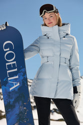 The Hooded Gathered Waist Short Goose Down Garment from GOELIA is a fusion of elegance and practicality, designed for the fashion-conscious skier. Its cinched waist and short cut allow for unrestricted movement on the slopes, while the hood provides extra protection against the chill. The light ice-blue hue reflects the winter sun, ensuring you stand out against the white canvas of the snow. Engineered with GOELIA's high-quality 90 white goose down, it offers exceptional warmth without the bulk, making it an ideal choice for those who want to transition seamlessly from a brisk ski run to a cozy chalet lounge.