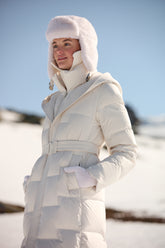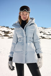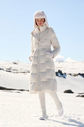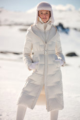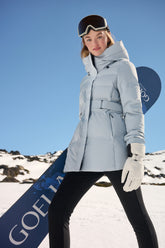 The Hooded Stand Collar Gathered Waist Long Goose Down Garment is the epitome of luxury and functionality, a perfect companion for the discerning skier looking for an elegant après-ski ensemble. The long silhouette offers extensive coverage and protection against the cold, while the stand collar and hood provide additional defense against brisk mountain air. The sophisticated belted waist not only accentuates the figure but also adds an element of high fashion to the practical design. Crafted with GOELIA's signature 90 white goose down, this jacket ensures warmth and comfort in the coldest of climates. Its serene color and refined style make it a versatile piece, equally suited for a serene walk in a winter wonderland or enjoying a warm drink by the fire. This garment is for those who demand warmth without sacrificing grace and style on their skiing holiday.
