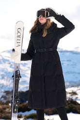The Hooded Gathered Waist Long Goose Down Garment with Belt by GOELIA is the quintessence of sophisticated skiwear. Its elongated form provides ample coverage from the frosty elements, while the sleek black fabric makes a timeless statement on the slopes. The belt cinches at the waist to offer a tailored fit, ensuring elegance is not lost in the layers needed for warmth. The hood serves as a chic barrier against snowflakes and gusts of wind, making it an essential for any ski enthusiast who values both function and fashion. This down jacket is perfect for skiers who seek a seamless transition from the rigorous activity of skiing to the relaxed ambiance of the ski lodge, providing an unmatchable combination of luxury, warmth, and style.