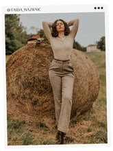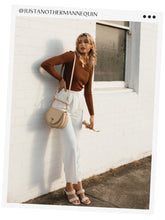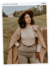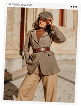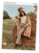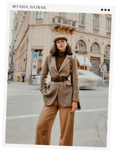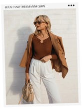 Infuse a touch of modernity into your wardrobe with the caramel color slim fit blazer. This statement piece comes to life when paired with a brown irregular design sweater and white wide-leg trousers. The juxtaposition of structured tailoring and contemporary design creates a visually striking ensemble that seamlessly transitions from day to night. The combination showcases GOELIA's commitment to blending classic styles with innovative elements, offering a fresh perspective on autumn fashion.