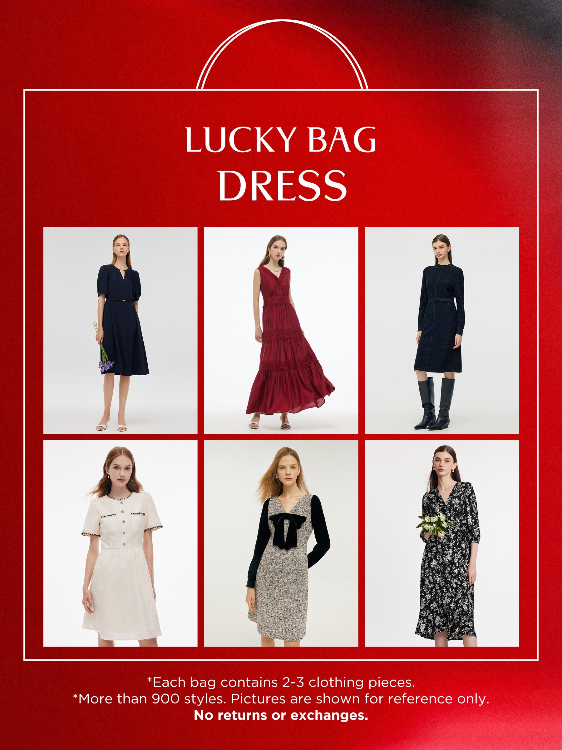 每個 Lucky Bag 內含 2-3 件全新且高品質的不同季節服裝。商品隨機挑選,為你的衣櫥增添驚喜元素。請注意,因本優惠性質,所有銷售皆為最終銷售。